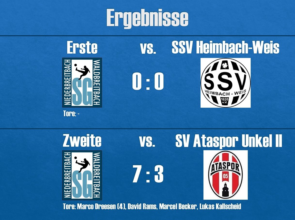 Nachdem die erste Mannschaft die letzten beiden Tabellenführer besiegen konnte, ging sie diesmal selbst als Tabellenführer und leichter Favorit in die Partie. Zu Gast im Wiedtal war der SSV Heimbach-Weis. Und es wurde auf dem tiefen Waldbreitbacher Rasen das erwartet schwere Spiel. Beide Mannschaften neutralisierten sich weitestgehend, sodass Torchancen und feine Spielzüge Mangelware waren. In der zweiten Halbzeit wurde das Spiel etwas ansehnlicher und beide Mannschaften erarbeiteten sich mehr Torchancen. Schlussendlich konnte jedoch keine der Beiden eine davon nutzen und so bleibe es in einem kampfbetonten Spiel bei einem 0:0 unentschieden. Nach zuletzt jeweils sechs Toren in den letzten zwei Spielen, konnte die zweite Mannschaft wieder auf ihre Offensivabteilung bauen. Gegen den direkten Tabellennachbarn aus Unkel konnte die Mannschaft mit 7:3 die Oberhand behalten. Nachdem die ersten 20 Minuten etwas verschlafen wurden, fand die Zwote noch vor der Pause in die Spur und konnte das Spiel durch sechs Tore in Folge drehen.