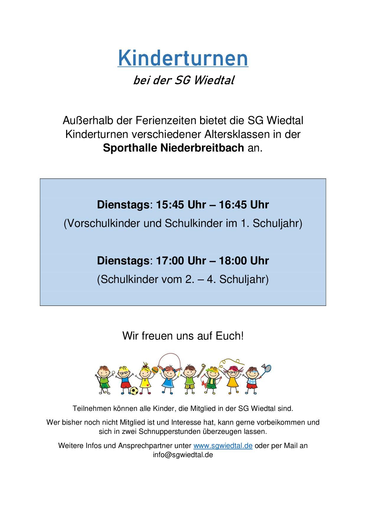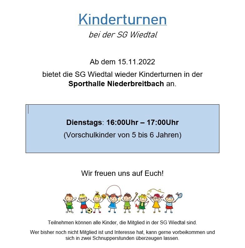 Ab dem 06.09.2021 bietet die SG Wiedtal wieder wöchentlich Kinderturnen in der Sporthalle Niede…