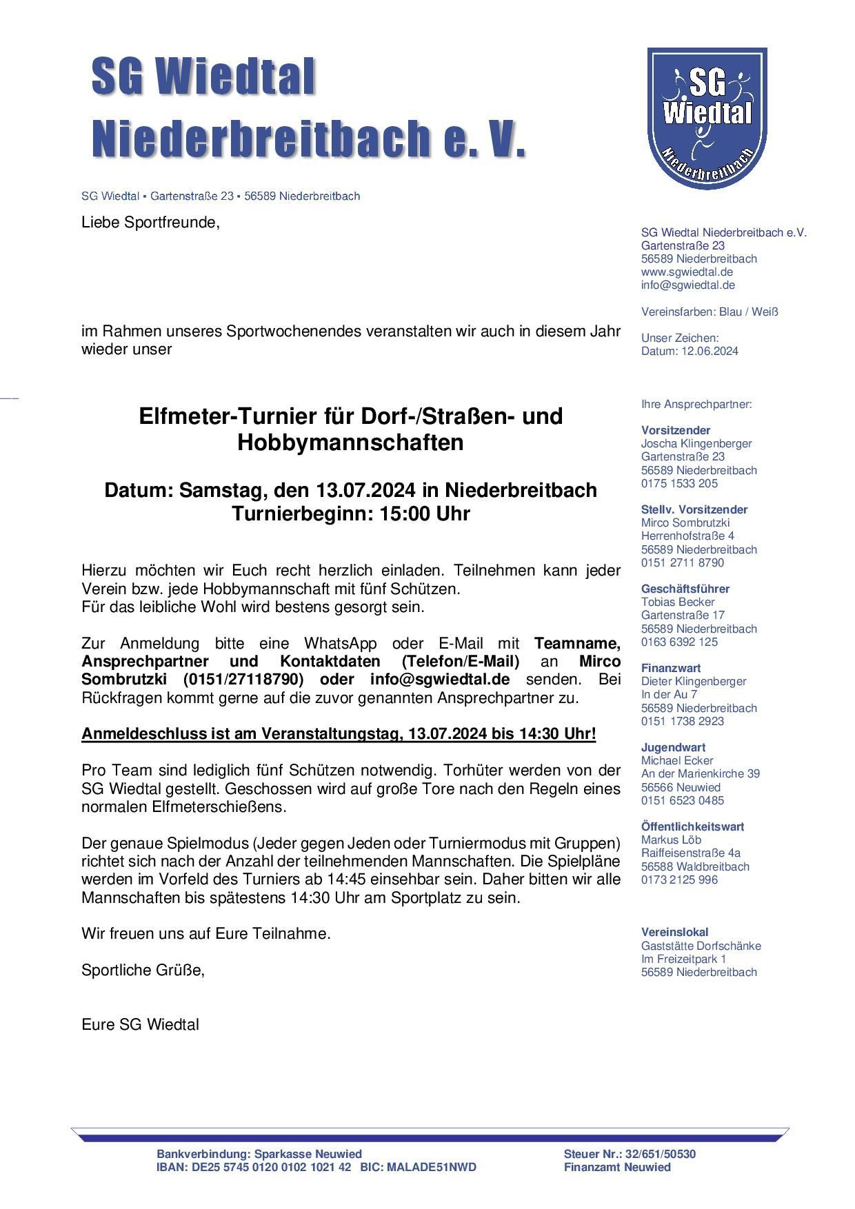 Am Samstag, 13. Juli, findet ab 15:00 Uhr das Elfmeter-Turnier der Ortsvereine, Straßenmannschaften, Stammtische und Kegelclubs statt. Pro Team sind lediglich fünf Schützen notwendig. Torhüter werden von der SG Wiedtal gestellt. Geschossen wird auf große Tore nach den Regeln eines normalen Elfmeterschießens. Auch hier folgt der Abschluss des Tages in Form von Musik und Kaltgetränken am Sportplatz in Niederbreitbach.
