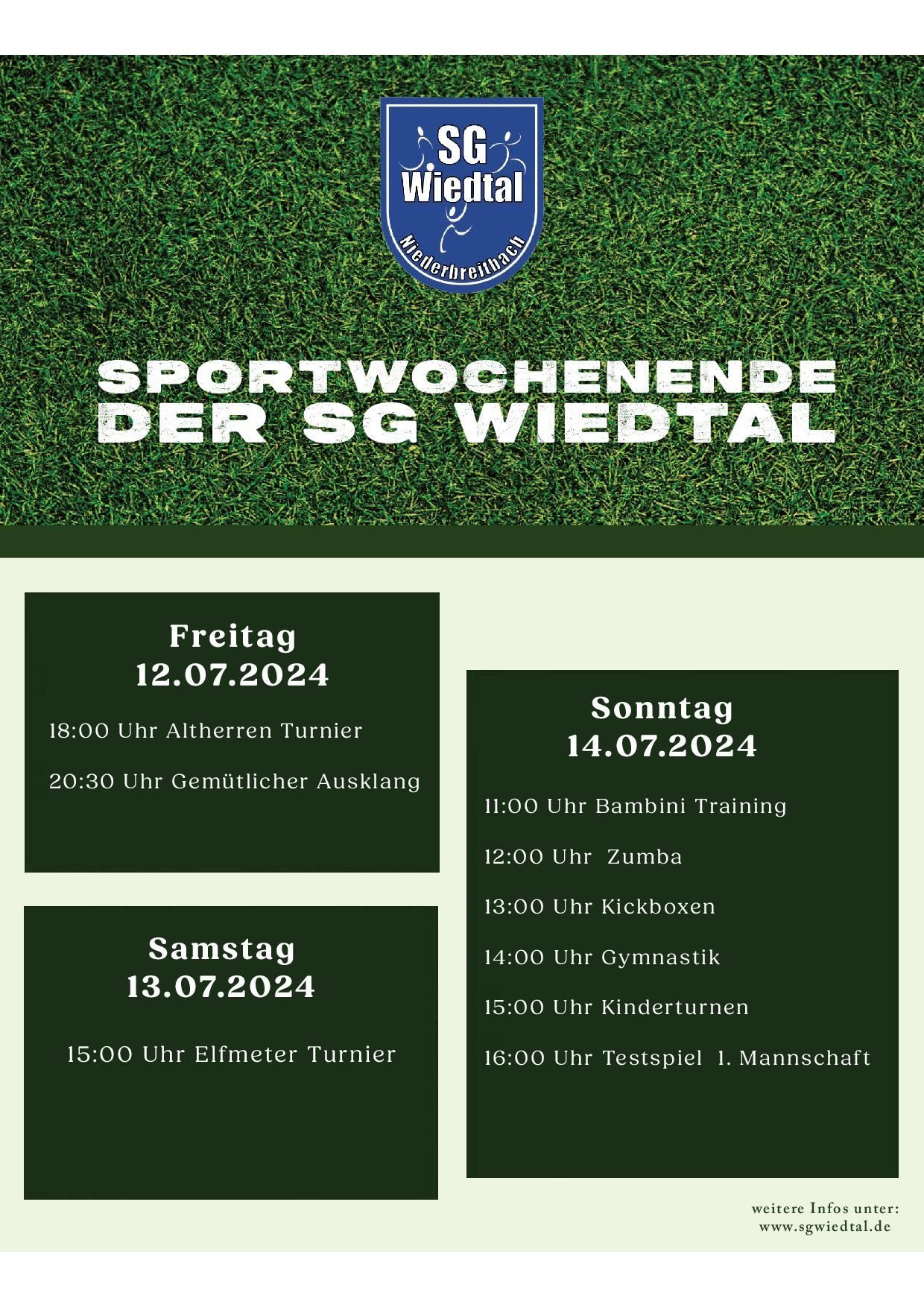 Der Sport prägt das Wochenende vom 12. bis 14. Juli 2024 in Niederbreitbach. Neben Fußballturnieren steht ein Schnuppertag für alle angebotenen Kurse der SG Wiedtal auf dem Programm.